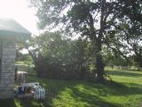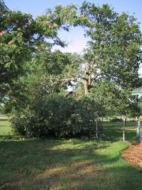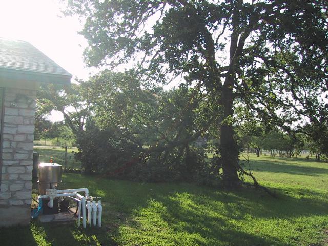 We got a good taste of Central Texas weather last night. A huge thunderstorm came out of the northwest about 9:30, carrying baseball sized hail, 60 MPH winds, heavy rain, and some reported funnel clouds (although thankfully no tornadoes touched down). We were fortunate enough not to get any of the big hail, but we got plenty of rain and the wind did some damage. It tore shingles from the house, the garage, and the pool house, scattered debris all over the yard, and tore a foot-thick limb from one of our oak trees. That broken branch made up about a third of the tree's upper canopy. The image at the left shows the tree from the front, where you can see the hole that's left in the tree's canopy. The image on the right is from the back, where you get a better idea of the size of the limb.