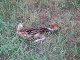 It's fawning season (or is that calving season?) for the neighborhood deer. Last week my neighbor came home to find a doe with a new fawn in his yard. He got some video footage of the fawn's first steps. A couple of days later I scared a very young fawn with the lawn mower. This morning on the way to work, I saw a doe and new fawn in my other neighbor's yard, and let Debra know. She went over with the camera and got the picture to the left. Debra actually found two fawns. One was either stillborn or died shortly after birth (the one in the picture is the live one). Twins? Probably, as multiple births aren't uncommon with our neighborhood deer.