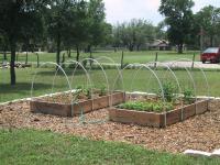Debra and I got the garden in a couple of weeks ago, and things are growing nicely. The garden beds shown are simple 4' by 8' boxes that I put together with 2"x12" lumber. The covers are just deer netting over 1/2" PVC pipe. The PVC hoops fit into pieces of 3/4" PVC that are attached to the sides of the boxes. Anchoring the deer netting is no problem, and it's stayed in place during some recent 30+ MPH winds. When we stepped back to look at the finished garden, we both thought we should have included another box. If we get ambitious this winter we'll empty the existing boxes, move them closer together, and add a new one.